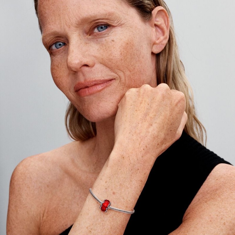 Celebra la temporada con nuestro Charm de Cristal de Murano Magia Navideña. El centro de nuestro charm de cristal de Murano rojo está recubierto con una lámina dorada que irradia un cálido brillo desde su interior. El exterior del charm se presenta envuelto en árboles de Navidad, muñecos de jengibre y corazones de caramelo en plata de primera ley que aportan un toque extra de diversión festiva.