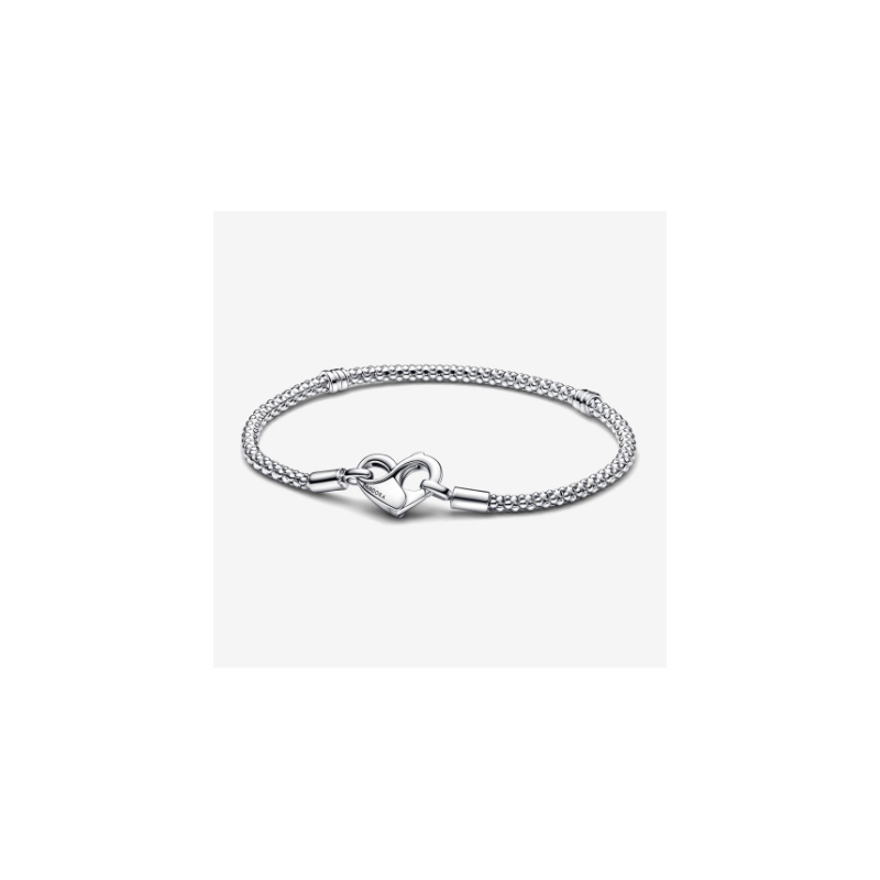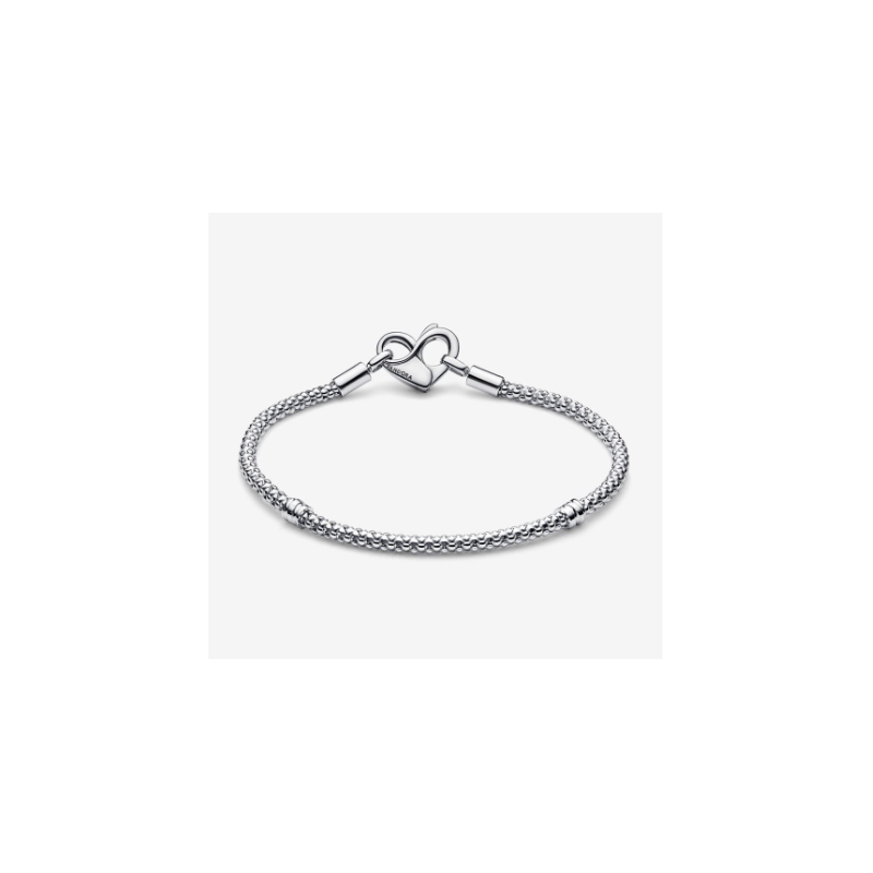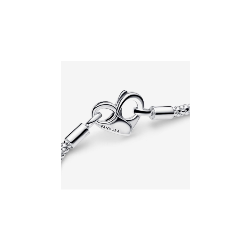 Actualiza tu colección con nuestro nueva Pulsera Cadena con Tachuelas de Pandora Moments. Acabada a mano en plata de primera ley, esta pulsera se presenta con una cadena flexible con textura y un cierre con forma de corazón que se puede abrir y el símbolo del infinito en su interior. Por favor, recuerda que esta pulsera admite hasta 14-18 charms.